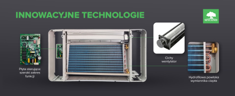 • Zaawansowana technologia → wężownicowy wymiennik ciepła wykonany z miedzianych rurek i mosiężnych kolektorów z aluminiowymi żebrami falistymi zapewnia wysoką wydajność ogrzewania i chłodzenia;