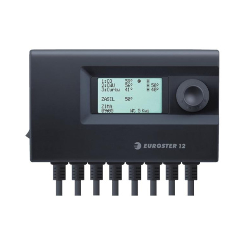 Euroster 12 to elektroniczny, programowalny sterownik tygodniowy przeznaczony do sterowania pracą 3 urządzeń w instalacji grzewczej. Swobodna konfiguracja pozwala na dostosowanie sterownika do potrzeb większości instalacji. Sterownik wyposażony jest w układ ochrony pompy przed zastaniem Anty Stop, który zapobiega procesowi zatarcia wirnika nieużywanej pompy. Po zakończeniu sezonu grzewczego, system co dwa tygodnie samoczynnie uruchamia pompę na 30 sekund (aby system działał po sezonie, sterownik należy pozostawić włączony). Euroster 12 posiada 3 niezależne wyjścia przekaźnikowe z możliwością ustawienia każdego wyjścia w tryb: pompa co., pompa c.w.u, termostat, pompa podłogowa, praca czasowa oraz dmuchawa.