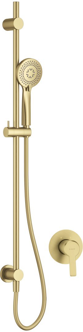 Komplet podtynkowy Arnika składa się ze słuchawki prysznicowej z wężem, umocowanej na eleganckim drążku oraz podtynkowej baterii. Mosiężny uchwyt słuchawki można przesuwać do dowolnej pozycji. Słuchawka prysznicowa posiada 3 funkcje strumienia: strumień deszczowy, hydromasaż i mieszany oraz system anti-calc, ułatwiający czyszczenie jej z osadu i kamienia. Bateria jest jednouchwytowa, z wygodną dźwignią i ceramiczną głowicą. Wszystko wykończone w szczotkowanym złotym kolorze.